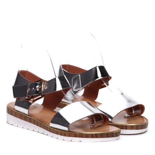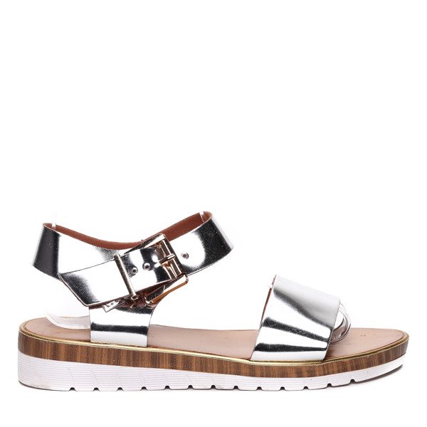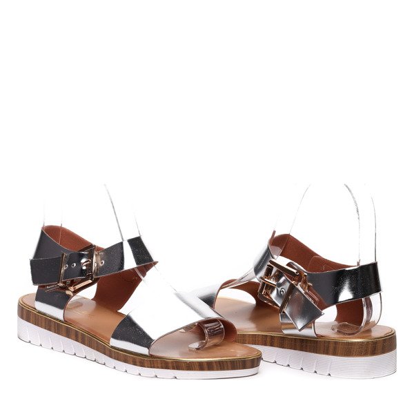 - Sandały na płaskiej podeszwie wykonane z metalicznej, ekologicznej skóry. Obuwie zapinane na sprzączkę z boku. Sprawdzą się świetnie jako dodatek do sukienek.