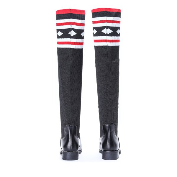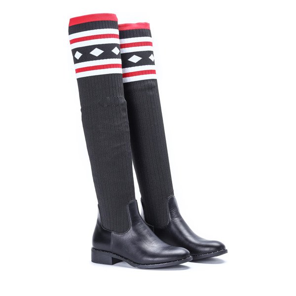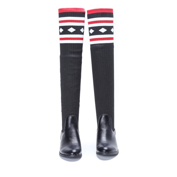 - Длинные ботинки на плоском каблуке из искусственной кожи и ткани. Верх, имитирующий носок, украшен узорами. Посередине, в нижней части, утеплитель в виде меха. Идеально для холодных дней!